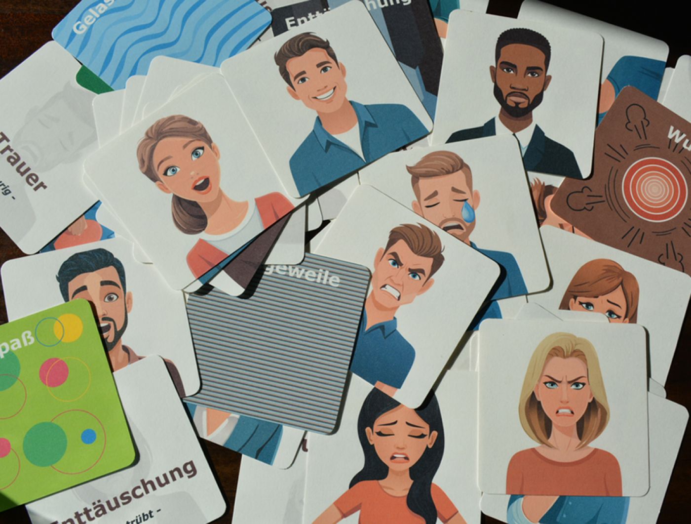 Das Mimik-Memory besteht aus Karten, auf denen unterschiedliche Mimiken von Menschen dargestellt werden. In männlicher sowie weiblicher Ausführung. Auf einer weiteren Karte, auf der der Hintergrund grau unterlegt ist, steht die Bezeichnung des Gemütszustandes. Zusätzlich gibt es eine Karte mit einer als Muster übersetzten Mimik. Bei diesem Spiel gibt es mehrere Spielvarianten. Es ist besonders für Menschen mit Autismus und Aphasie geeignet, um Emotionen besser deuten zu lernen. Auch für junge Kinder spannend, um ihren Wortschatz zu erweitern.