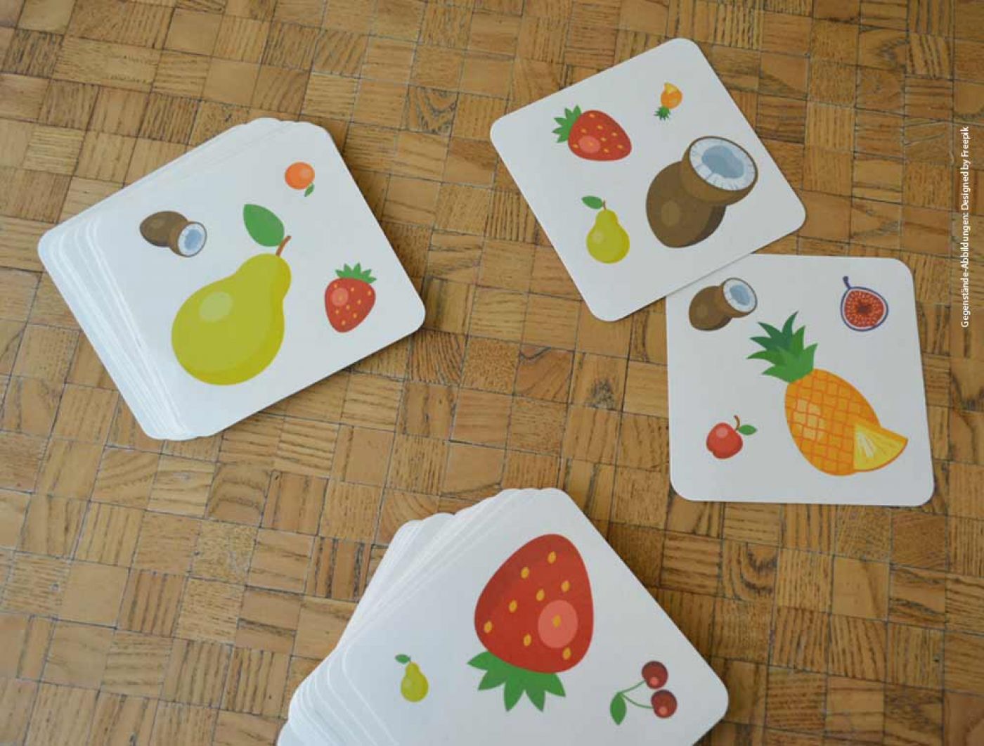 Diese Karten sind mit je 4 unterschiedlich großen Früchten angelegt. Für Menschen, die schlechter sehen sowie Autisten und Menschen mit Aphasie, bietet diese Spielvariante der Paar-Sammlung Klarheit und Leichtigkeit.